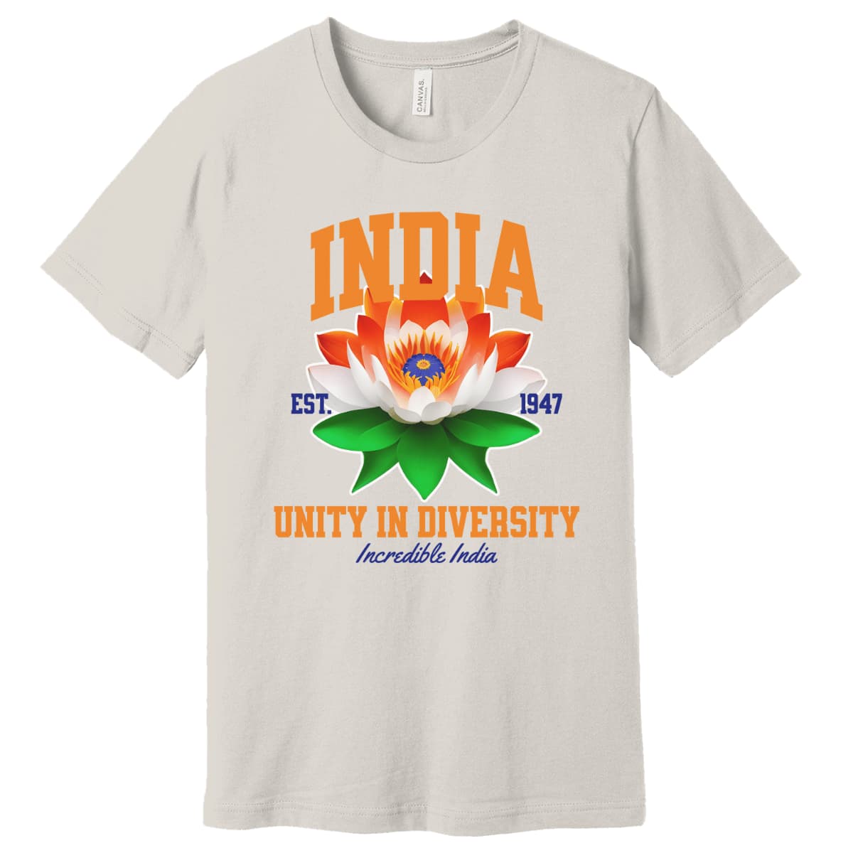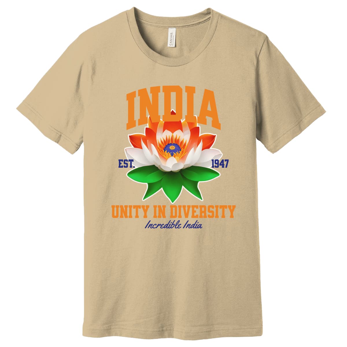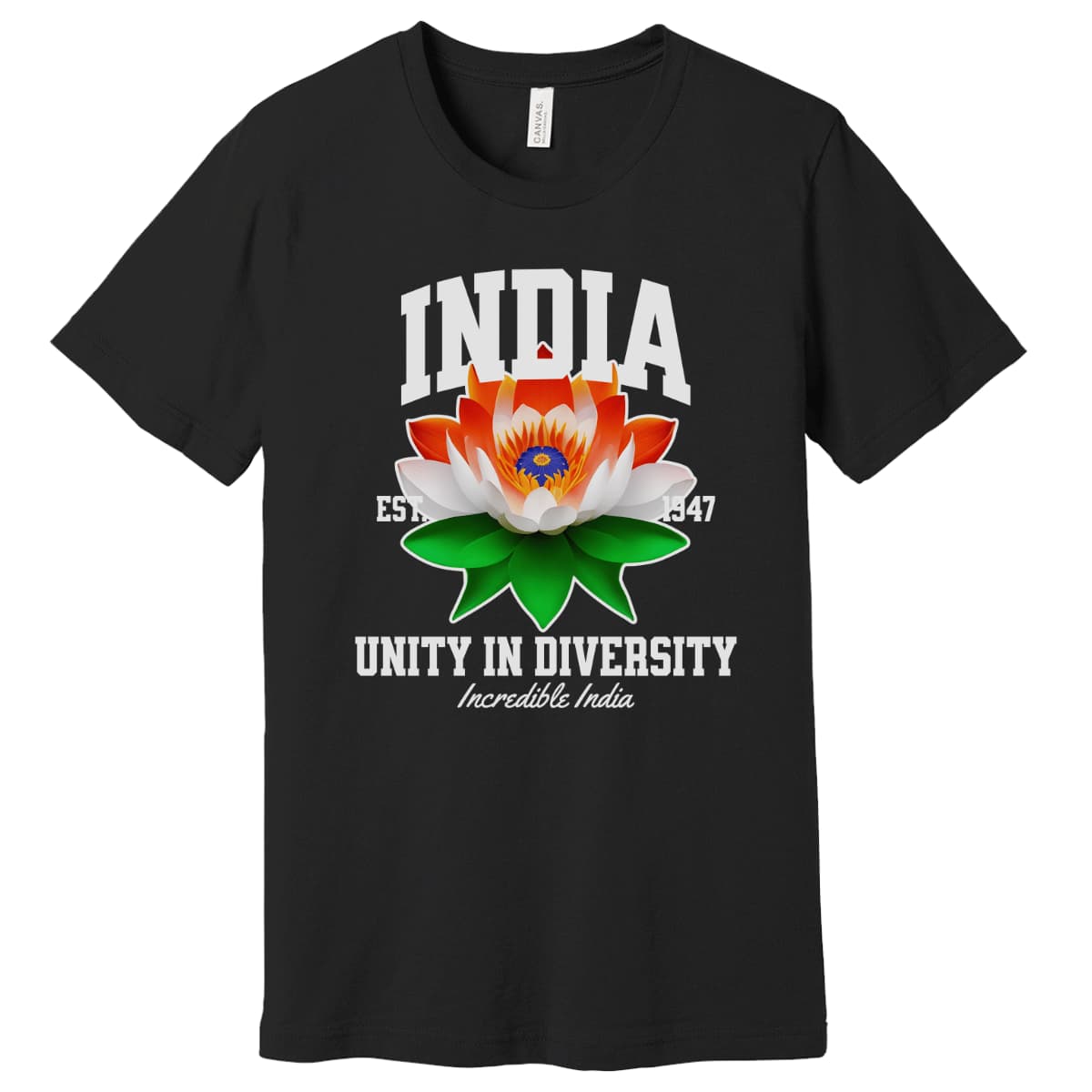 The lotus design is gracefully adorned with the tricolor shades of the Indian flag, echoing the patriotic message “Unity in Diversity” and the iconic slogan “Incredible India”. The artwork pops brilliantly against a bold black background for a powerful visual impact.