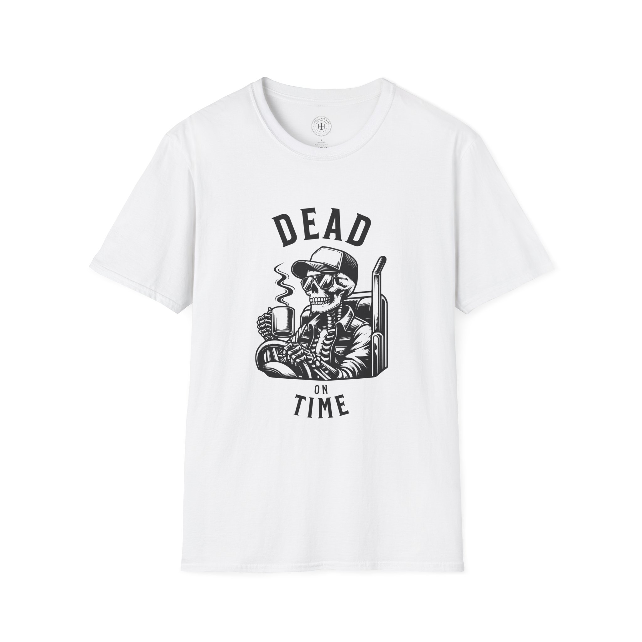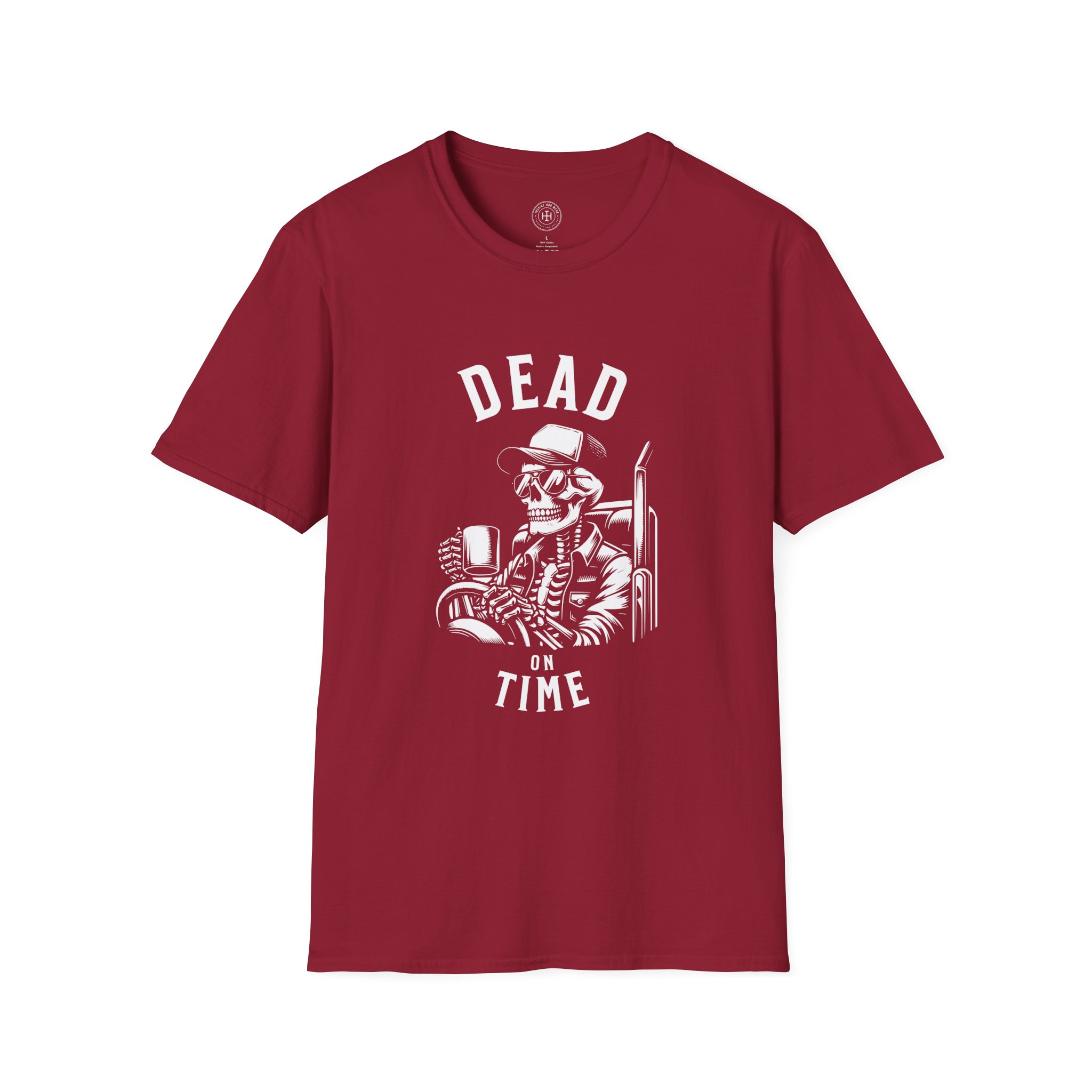 Do you love your 18-wheeler, semi-trailer truck, or big rigs? This ‘Dead On Time’ skeleton trucker design is perfect for truck driving men and women who embrace the humor and hard work of life on the road. Featuring a skeleton wearing a trucker cap and sunglasses, holding a steaming coffee cup, this funny design celebrates truckers who move America every day. Whether you’re a fan of diesel-powered rigs, long hauls, or dark humor, this t-shirt is the ideal gift for truckers, truck lovers, and anyone who loves the open road.
